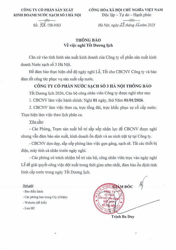 - Thông báo về việc duy tu bảo dưỡng hệ thống cấp nước từ ngày 26/12/2025 đến 27/12/2025.