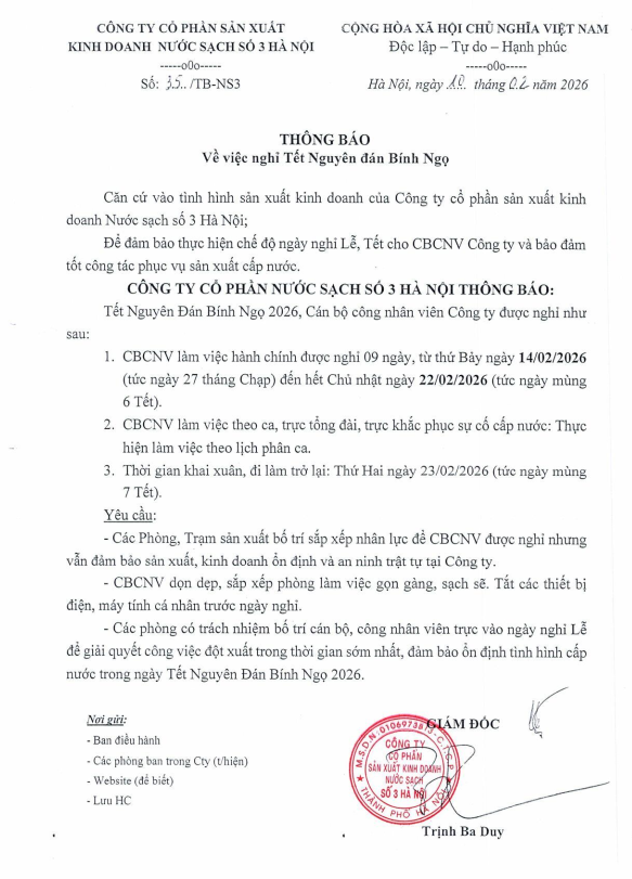 - Thông báo về việc duy tu bảo dưỡng hệ thống cấp nước từ ngày 26/12/2025 đến 27/12/2025.